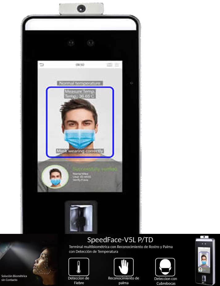 La serie SpeedFace-V5L es una versi贸n completamente actualizada de la terminal de reconocimiento facial con luz visible SpeedFace. Combinando avanzados algoritmos de reconocimiento facial y la 煤ltima tecnolog铆a de visi贸n por computadora, reconoce una gran cantidad de rostros y palmas de forma ultra-r谩pida, sin contacto, aumentando la seguridad e higiene en todos los aspectos. El reconocimiento biom茅trico sin contacto, junto con la nueva funci贸n de detecci贸n de temperatura corporal y rostros con cubrebocas, elimina problemas severos de higiene y previene el contagio de virus e infecciones de manera efectiva.